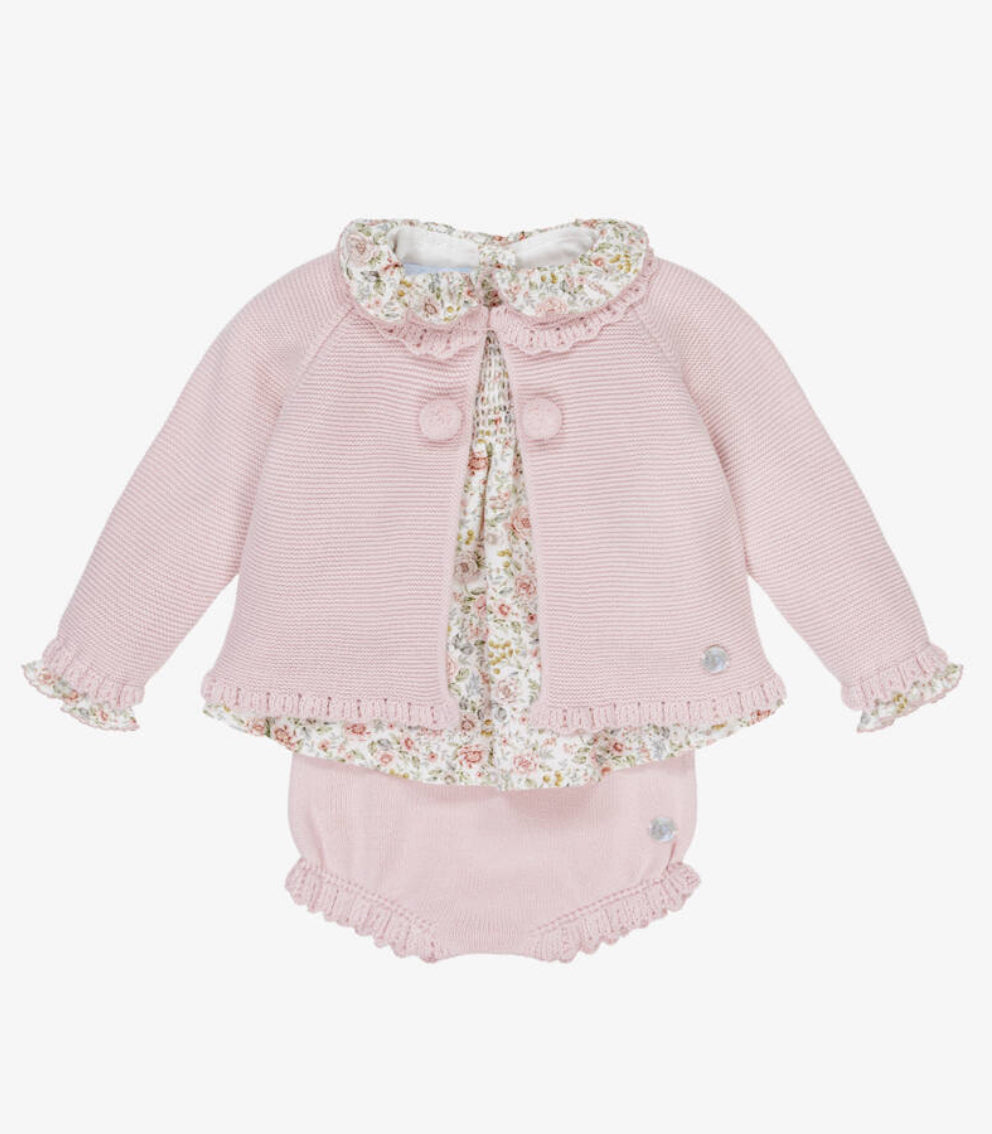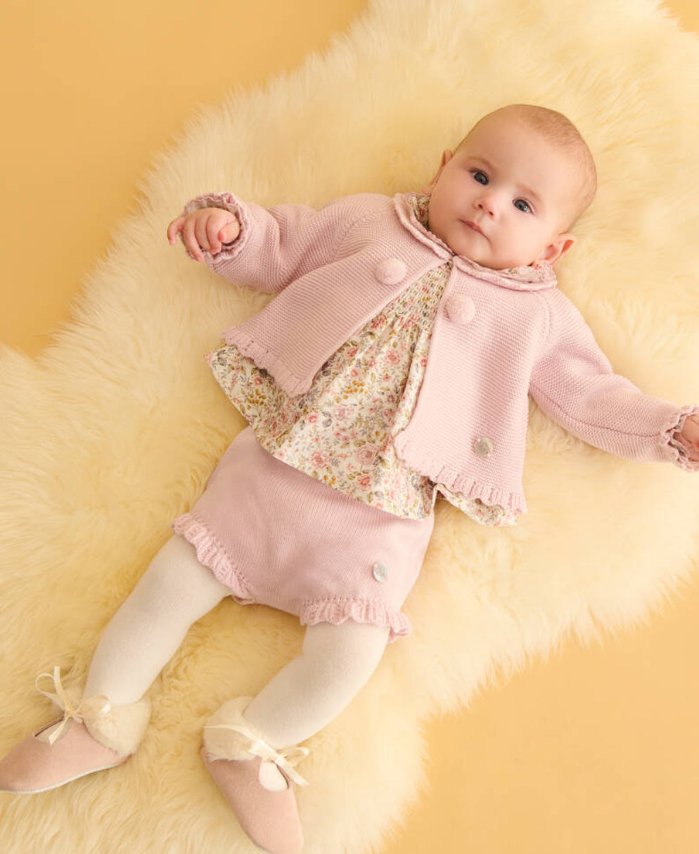 A delightful pink shorts set for baby girls by Artesanía Granlei. The pretty floral cotton blouse has a gently shirred bodice and a frilled collar and cuffs. It is partially lined and fastens on the back with buttons. It pairs beautifully with comfortable, pink knitted shorts. A matching cardigan with little pom-poms on the front completes the sweet look.